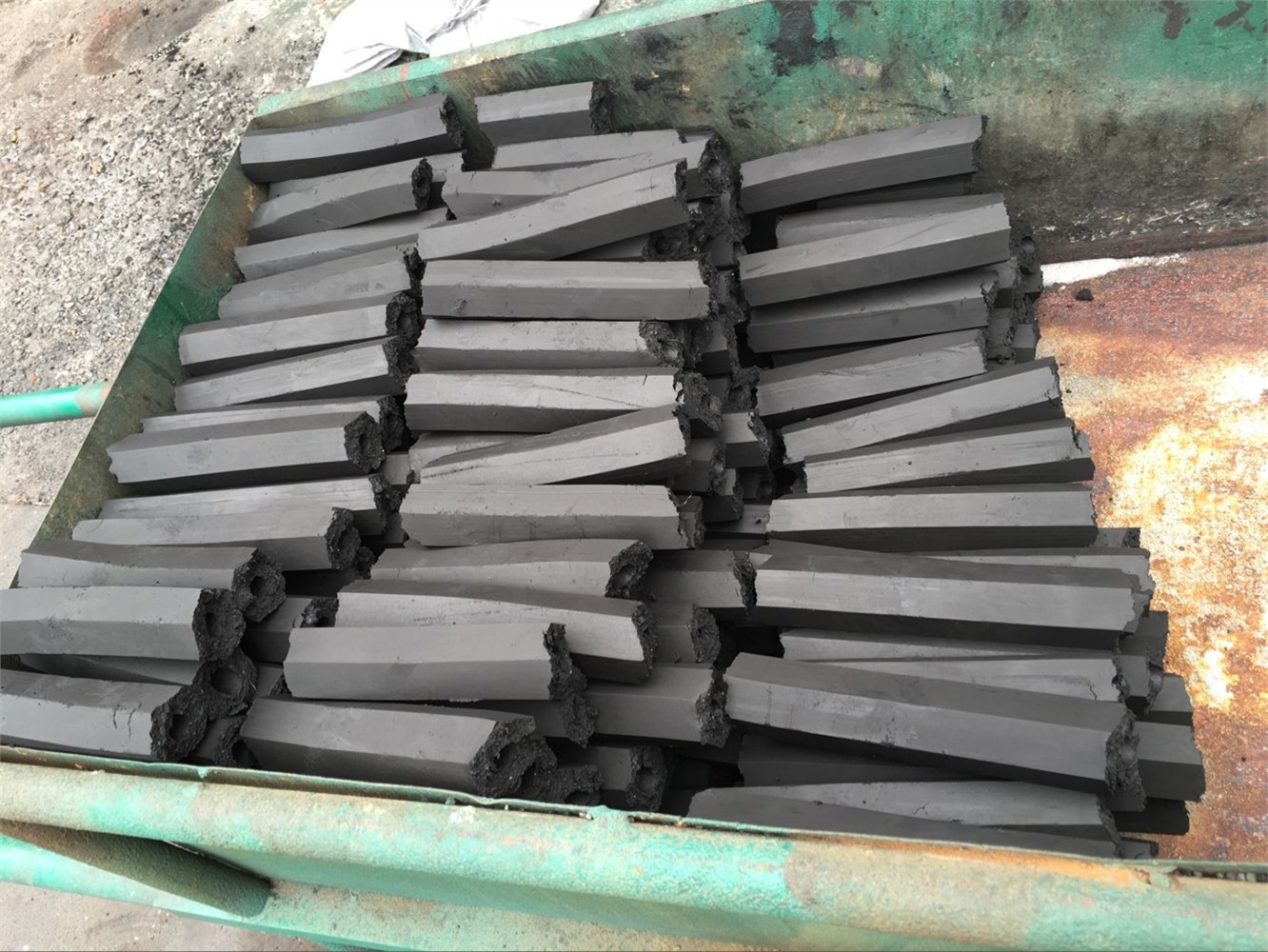 图中显示的是:140型炭粉成型机制出的成品棒现场图;成品棒规格:空心六棱